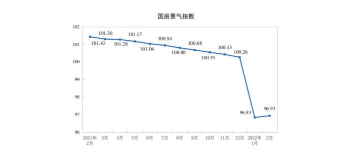2月份,房地產(chǎn)開發(fā)景氣指數(shù)(簡(jiǎn)稱“國(guó)房景氣指數(shù)”)為96.93。