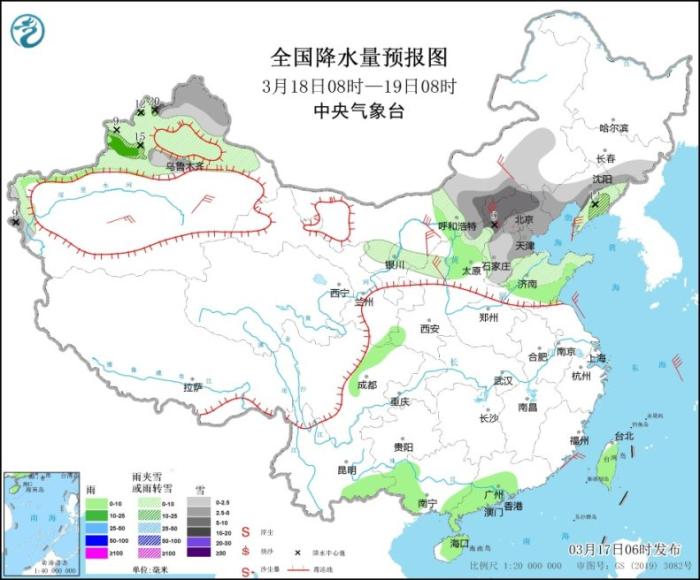 3月18日8時至19日8時,新疆北北疆大部和南疆西部山區(qū)、內(nèi)蒙古中部、陜西北部、山西北部、京津冀大部、山東中北部、遼寧大部、吉林東南部等地部分地區(qū)有小到中雪或雨夾雪,其中,河北北部、內(nèi)蒙古中部偏南地區(qū)、遼寧中部、新疆北疆西北部等地部分地區(qū)有大到暴雪。新疆伊犁河谷、陜西中部、山東南部、四川盆地西北部、云南東南部、廣西西部、廣東西南部、海南島、臺灣島等地部分地區(qū)有小雨,局地中雨。內(nèi)蒙古中西部、新疆南疆盆地、陜西北部等地部分地區(qū)有4~6級風(fēng)。