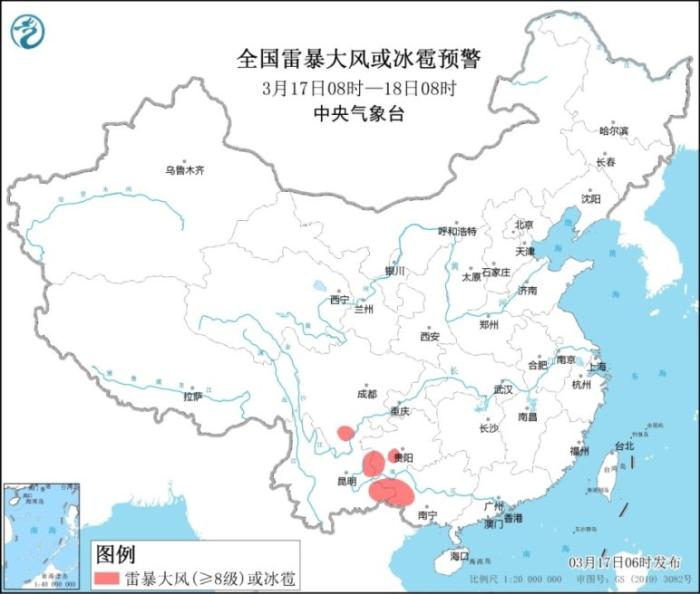 全國雷暴大風(fēng)或冰雹預(yù)警圖(3月17日8時-18日8時)