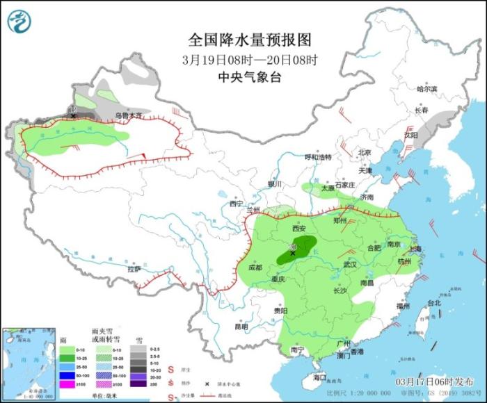3月19日8時至20日8時,吉林東部、遼寧東部、新疆西北部和南疆西部山區(qū)等地部分地區(qū)有小到中雪,其中,新疆西北部局地有大到暴雪。西北地區(qū)東南部、華北南部、黃淮、江淮、江漢、江南北部和西部、西南地區(qū)東部、華南大部以及新疆南疆盆地北部等地有小雨,局地有中雨(10~20毫米)。內(nèi)蒙古中部、遼寧、河北北部、山東半島、河南中東部、湖北東部、浙江、新疆南疆盆地等地部分地區(qū)有4~6級風(fēng),陣風(fēng)7~8級。
