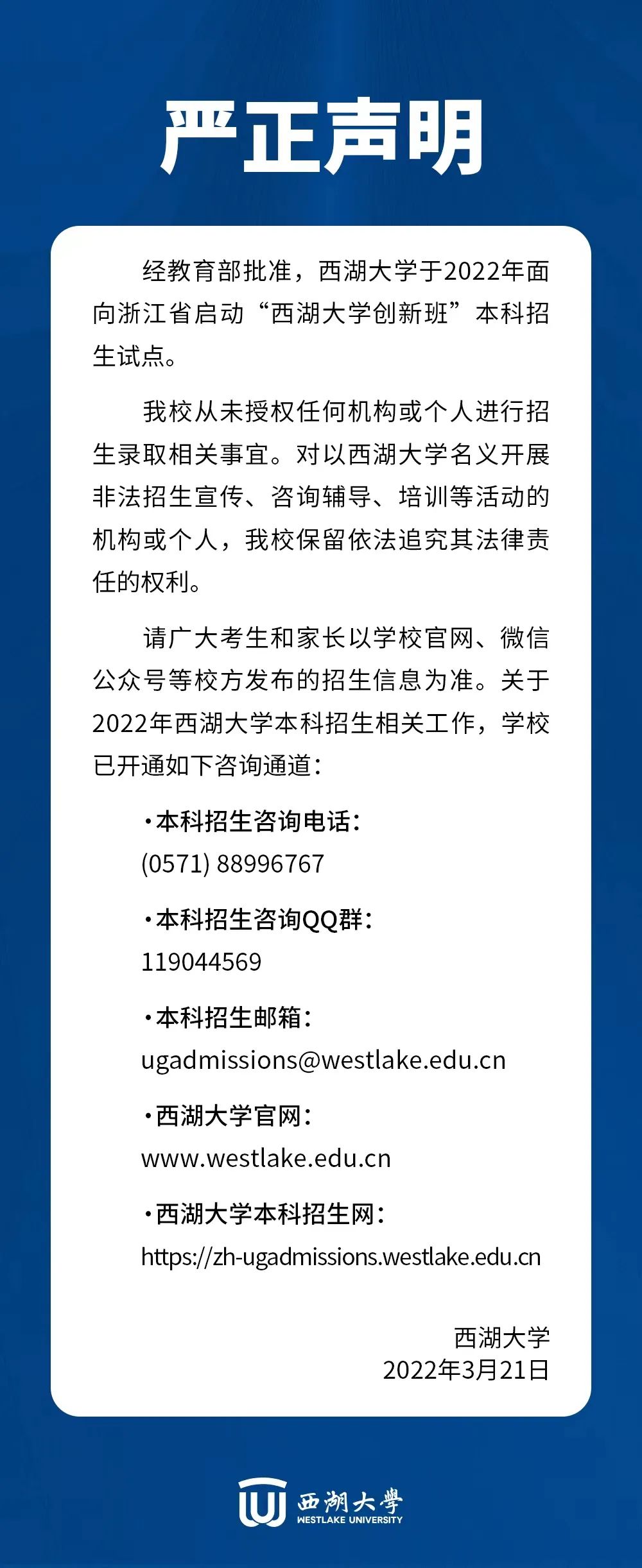 中新網(wǎng)3月21日電 據(jù)“西湖大學WestlakeUniversity”微信公眾號消息,3月21日,西湖大學發(fā)布《關于2022年西湖大學本科招生的嚴正聲明》,聲明指出,經(jīng)教育部批準,西湖大學于2022年面向浙江省啟動“西湖大學創(chuàng)新班”本科招生試點。該校從未授權任何機構或個人進行招生錄取相關事宜。對以西湖大學名義開展非法招生宣傳、咨詢輔導、培訓等活動的機構或個人,該校保留依法追究其法律責任的權利。