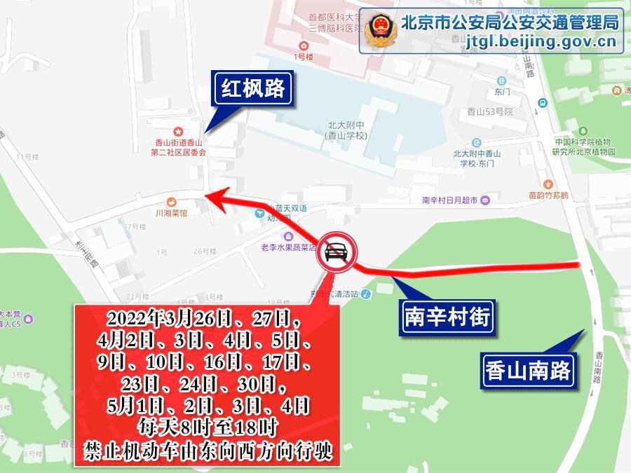 特別提示去往香山地區(qū)的市民朋友:4月2日、3日、4日、5日、9日、10日、16日、17日、23日、24日,5月1日、2日、3日、4日,每天8時至18時,南辛村街(紅楓路至香山南路段)禁止機動車由東向西方向行駛。