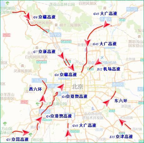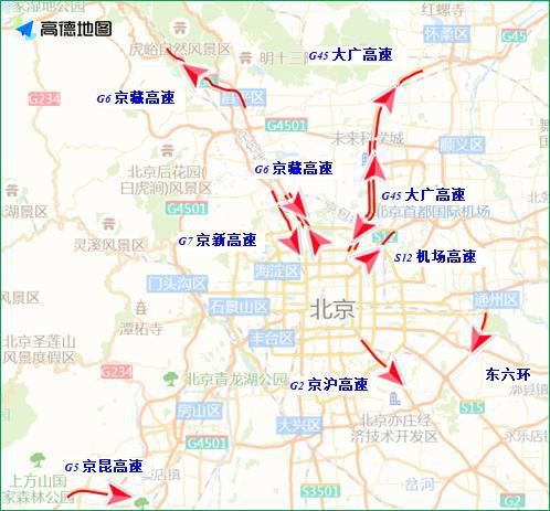 4日、5日12至20時,進京方向的交通壓力將明顯上升,其中京藏高速八達嶺、居庸關(guān)、西三旗、北沙灘,京承高速黃港、太陽宮,京港澳高速西道口、琉璃河,京開高速榆垡、玉泉營等路段車流較為集中。