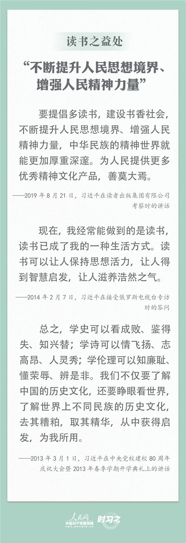 讀書滋養(yǎng)美好心靈。習(xí)近平總書記曾多次談及讀書的好處,“人民群眾多讀書,我們的民族精神就會(huì)厚重起來、深邃起來” 。4月23日是世界讀書日,跟習(xí)近平總書記學(xué)讀書之道,讓學(xué)習(xí)點(diǎn)亮生活,讓全民閱讀蔚然成風(fēng)。