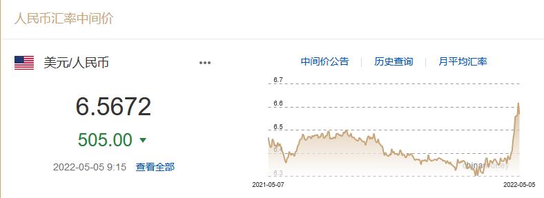 5月5日人民幣對美元匯率中間價較上日上調(diào)505點
