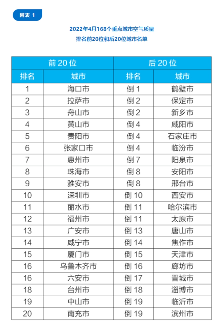 在重點(diǎn)城市排名中,4月,168個(gè)重點(diǎn)城市中,??凇⒗_和舟山市等20個(gè)城市空氣質(zhì)量相對(duì)較好;鶴壁、保定和新鄉(xiāng)市等20個(gè)城市空氣質(zhì)量相對(duì)較差。