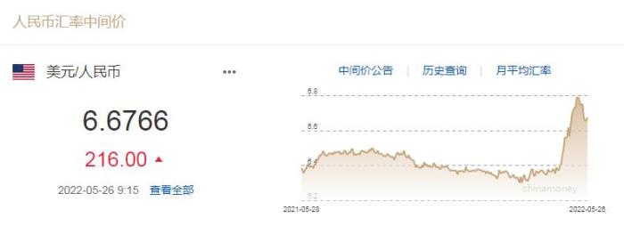 中新財(cái)經(jīng)5月26日電 中國人民銀行授權(quán)中國外匯交易中心公布,2022年5月26日銀行間外匯市場人民幣匯率中間價(jià)為:1美元對人民幣6.6766元。這較上一交易日下調(diào)216個(gè)基點(diǎn)。(完)