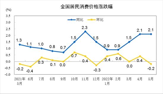 據(jù)國家統(tǒng)計局城市司高級統(tǒng)計師董莉娟介紹,從同比看,5月份CPI上漲2.1%,漲幅與上月相同。其中,食品價格上漲2.3%,漲幅比上月擴大0.4個百分點,影響CPI上漲約0.42個百分點。