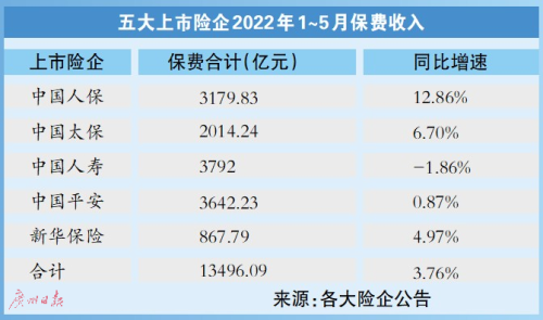五大上市險(xiǎn)企前5個(gè)月攬入保費(fèi)1.35萬(wàn)億元,財(cái)險(xiǎn)保費(fèi)增速基本穩(wěn)定