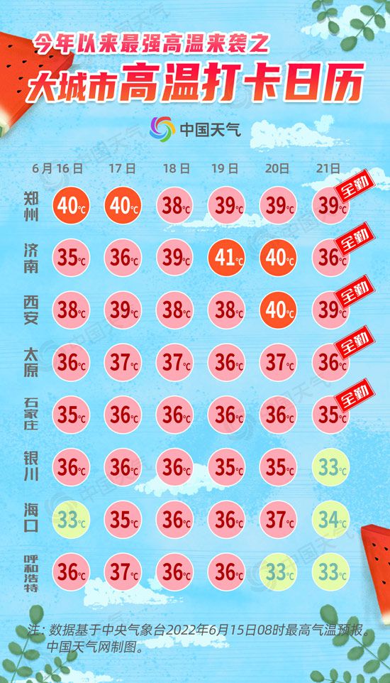 中國天氣網(wǎng)訊 今年以來最強(qiáng)高溫來襲!今(6月15日)起到22日,北方高溫強(qiáng)勢(shì)返場(chǎng),鄭州、濟(jì)南等地最高氣溫可達(dá)40℃或以上,部分地區(qū)高溫持續(xù)時(shí)間之長(zhǎng)、強(qiáng)度之強(qiáng)都是同期少見。中國天氣網(wǎng)推出大城市高溫打卡日歷,看哪些地方未來6天高溫全勤到崗。