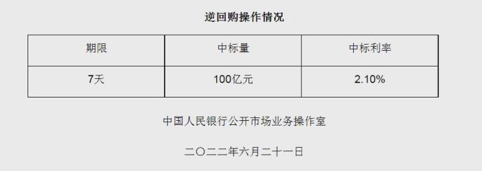 央行6月21日開(kāi)展100億元逆回購(gòu)操作 中標(biāo)利率2.10%