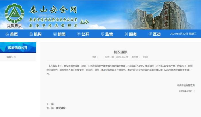 中新網(wǎng)6月22日電 據(jù)山東省泰安市應(yīng)急管理局網(wǎng)站消息,山東泰安市應(yīng)急管理局21日發(fā)布通報,6月21日上午,泰安市綠地公館一層的一門頭房因液化氣罐泄漏引發(fā)的爆炸事故,共造成13人受傷。截至目前,共有3人因受傷嚴(yán)重、傷情惡化,經(jīng)搶救無效死亡。其余受傷人員正在接受進一步治療。