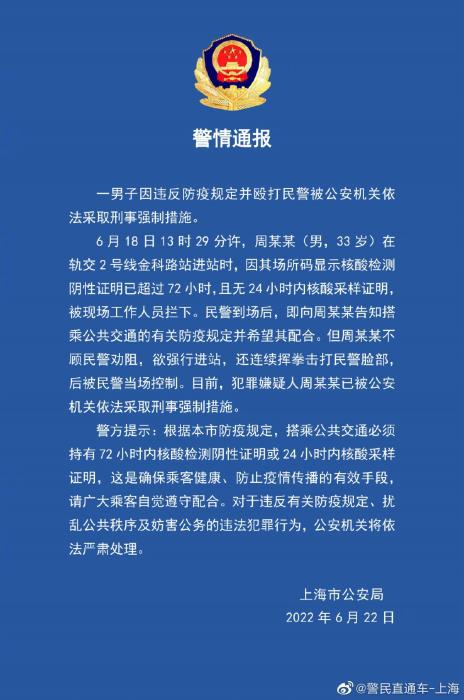 6月18日13時29分許,周某某(男,33歲)在軌交2號線金科路站進站時,因其場所碼顯示核酸檢測陰性證明已超過72小時,且無24小時內(nèi)核酸采樣證明,被現(xiàn)場工作人員攔下。民警到場后,即向周某某告知搭乘公共交通的有關防疫規(guī)定并希望其配合。但周某某不顧民警勸阻,欲強行進站,還連續(xù)揮拳擊打民警臉部,后被民警當場控制。目前,犯罪嫌疑人周某某已被公安機關依法采取刑事強制措施。