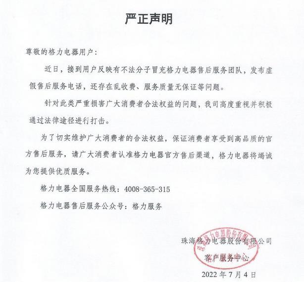 格力電器:有不法分子冒充售后服務(wù)團(tuán)隊(duì) 存在亂收費(fèi)等問題