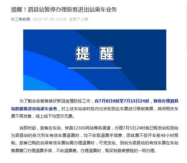 - 提醒!安徽泗縣站暫停辦理旅客進出站乘車業(yè)務(wù)