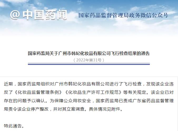 國家藥監(jiān)局:對(duì)廣州市韓妃化妝品有限公司立案調(diào)查