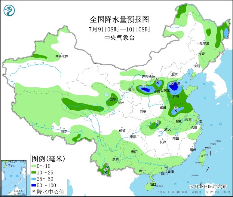 7月9日08時(shí)至10日08時(shí),黑龍江東北部、陜西北部、山西北部、河北中南部、黃淮東部、江淮、云南西南部等地部分地區(qū)有中到大雨,其中,陜西北部、山西北部、河北中南部、山東北部等地局地有暴雨(50~90毫米);南海南部海域有5~7級(jí)、陣風(fēng)8級(jí)的偏西風(fēng)。