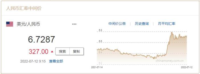 中新網7月12日電 中國人民銀行授權中國外匯交易中心公布,7月12日,銀行間外匯市場人民幣對美元匯率中間價報6.7287元,調貶327個基點。(中新財經)