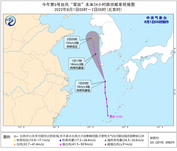 此外,今年第6號臺風“翠絲”已于昨天下午生成,其中心今天早晨05時位于韓國濟州島南偏東方向約250公里的東海北部海面上,預計將以每小時30-35公里的速度向北偏西方向移動,強度逐漸減弱并消散。