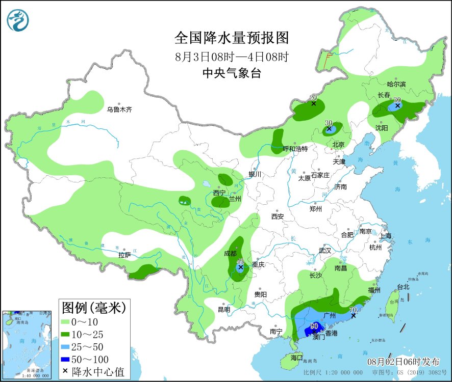 8月3日08時(shí)至4日08時(shí),內(nèi)蒙古中部、河北北部、吉林東部、遼寧北部、四川盆地西部和南部、廣西東部、廣東大部、福建東南部等地部分地區(qū)有中到大雨,其中,廣東西南部和東部沿海等地部分地區(qū)有暴雨(50~90毫米)。內(nèi)蒙古東北部部分地區(qū)有4~5級風(fēng)。