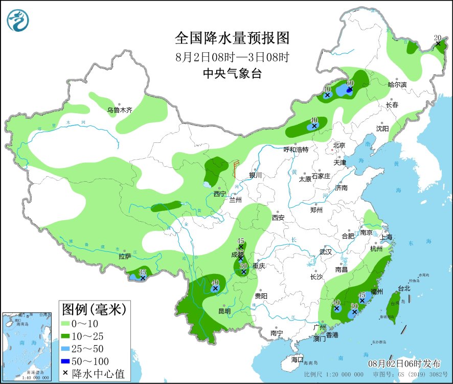 8月2日08時(shí)至3日08時(shí),青海北部和南部、內(nèi)蒙古中東部、黑龍江東北部、四川中部和南部、云南西部、江西東南部、浙江東南部、福建東部和南部、廣東東部、臺灣島等地部分地區(qū)有中到大雨,局地暴雨(50~60毫米)。內(nèi)蒙古西部部分地區(qū)有4~5級風(fēng)。