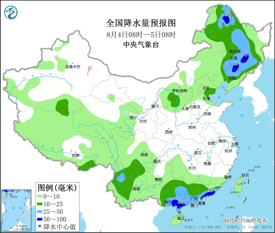 8月4日08時(shí)至5日08時(shí),內(nèi)蒙古東北部、東北地區(qū)大部、四川南部、云南中部和西北部、廣西大部、廣東大部等地有中到大雨,其中,內(nèi)蒙古東北部、黑龍江西北部和東南部、吉林中部、遼寧北部、廣西東南部沿海、廣東西南部和東部沿海等地部分地區(qū)有暴雨(50~90毫米)。黑龍江西北部部分地區(qū)有4~6級風(fēng)。