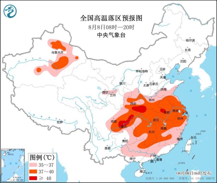 預(yù)計(jì)8月8日白天,四川東部、重慶、陜西中南部、山東中南部、河南、安徽、江蘇、上海、湖北、貴州東部、湖南、江西、浙江、福建、廣西中北部、廣東中北部及新疆南疆盆地東部和北疆南部等地有35~39℃高溫天氣,其中,陜西東南部、湖北西北部、重慶中西部等地局地可達(dá)40℃或以上。中央氣象臺(tái)8月8日06時(shí)繼續(xù)發(fā)布高溫橙色預(yù)警。