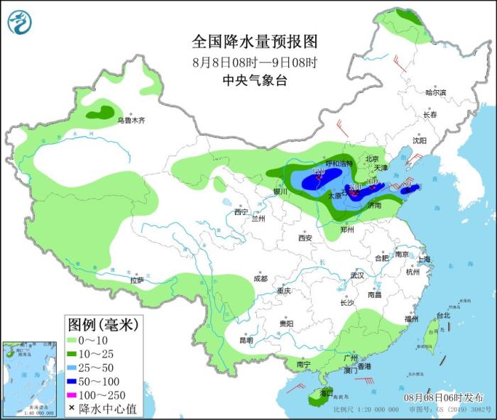 8月8日08時(shí)至9日08時(shí),內(nèi)蒙古河套地區(qū)、陜西北部、山西北部和東部、河北中南部、山東北部等地的部分地區(qū)有大到暴雨,其中,陜西北部、河北南部、山東西北部等地局地有大暴雨(100~130毫米)。內(nèi)蒙古中東部、遼東半島、山東半島等地部分地區(qū)有4~5級(jí)風(fēng)。