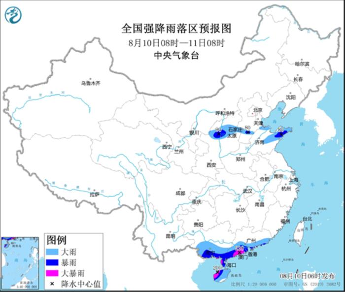 中央氣象臺8月10日06時繼續(xù)發(fā)布暴雨藍色預警:預計,8月10日08時至11日08時,廣東南部、海南島、廣西南部及陜西北部、山西中部、河北南部、山東中東部等地有大雨或暴雨,其中,廣東西南部、海南島西北部等地的部分地區(qū)有大暴雨(100~220毫米)。上述部分地區(qū)伴有短時強降水(最大小時降雨量30~50毫米,局地可超過60毫米),局地有雷暴大風或冰雹等強對流天氣。