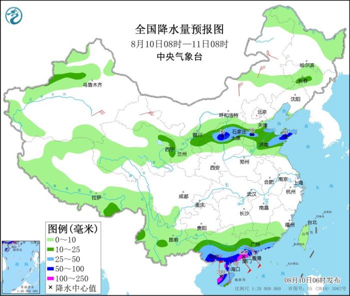 8月10日08時至11日08時,新疆伊犁河谷和沿天山附近、青海東部、寧夏中部、陜西北部、山西中北部、河北南部、山東大部及廣東中南部、海南島、廣西中南部等地有中到大雨,其中,陜西北部、山西中部、河北南部、山東半島西部、廣東南部、海南島西部、廣西南部等地的部分地區(qū)有暴雨或大暴雨(100~220毫米)。甘肅西部、內蒙古東部、廣東南部、廣西南部、海南島等地部分地區(qū)有4~6級風,沿海地區(qū)陣風可達7~8級。