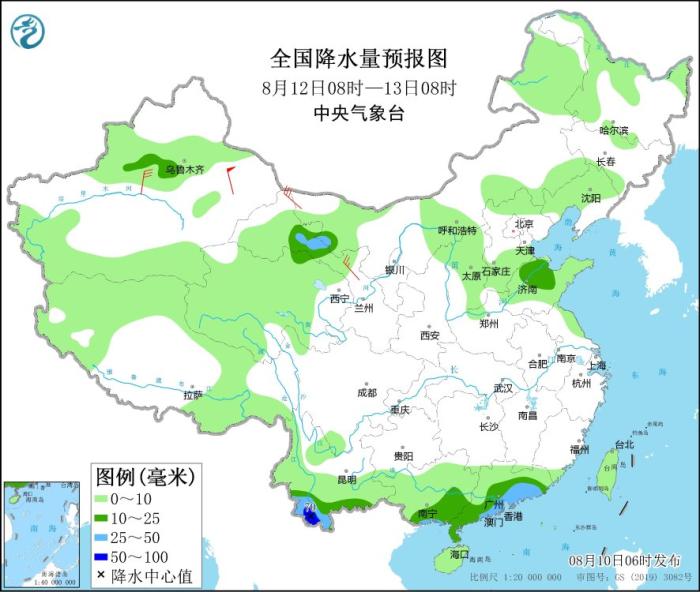 8月12日08時至13日08時,新疆沿天山地區(qū)、甘肅西部、山東北部、廣東中南部、廣西南部、云南南部等地的部分地區(qū)有中到大雨,其中,云南西南部等地局地有暴雨(50~70毫米)。內蒙古西北部、甘肅河西等地部分地區(qū)有4~6級風,其中,新疆東部部分地區(qū)有7~8級風。