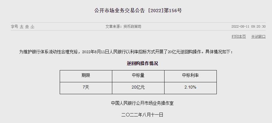 中新網8月11日電 據央行網站11日消息,為維護銀行體系流動性合理充裕,2022年8月11日人民銀行以利率招標方式開展了20億元逆回購操作。中標利率為2.10%。(中新財經)
