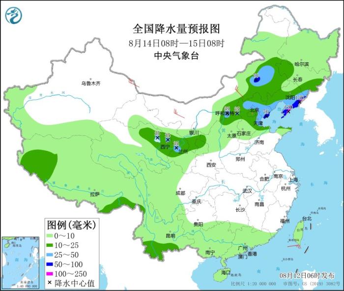 8月14日08時(shí)至15日08時(shí),內(nèi)蒙古東部、青海東北部、甘肅南部、寧夏南部、華北中北部、山東北部、遼寧大部、吉林東南部、云南南部等地部分地區(qū)有中到大雨,其中,遼寧東部和南部、河北東北部等地部分地區(qū)有暴雨,局地大暴雨(100~120毫米)。內(nèi)蒙古中西部、新疆東部等地部分地區(qū)有4~6級風(fēng)。