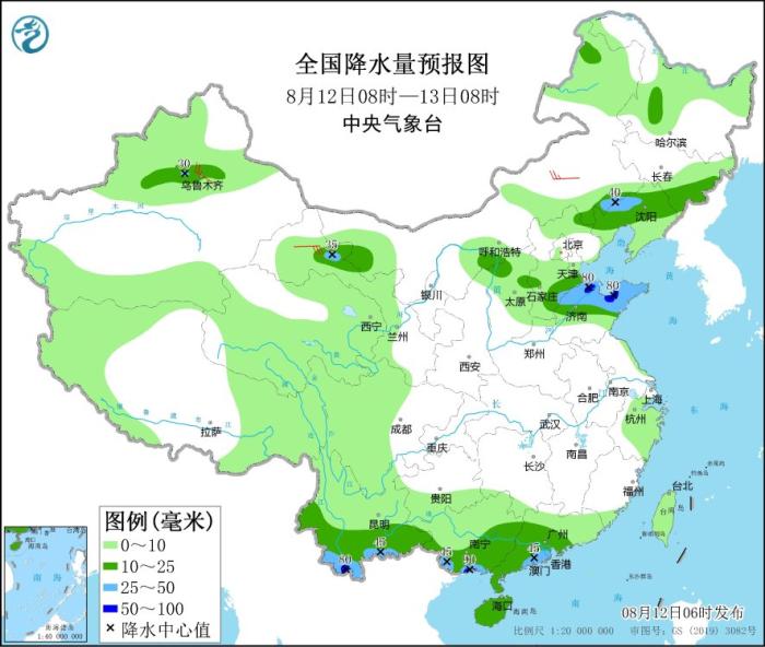 8月12日08時(shí)至13日08時(shí),內(nèi)蒙古東南部、吉林東部、遼寧北部、新疆沿天山地區(qū)、甘肅河西、陜西北部、河北南部、山東中北部、云南南部、華南南部和海南島等地部分地區(qū)有中到大雨,其中,山東北部、云南西南部、廣西南部沿海等地部分地區(qū)有暴雨(50~90毫米)。內(nèi)蒙古中部、甘肅河西等地部分地區(qū)有4~6級風(fēng)。