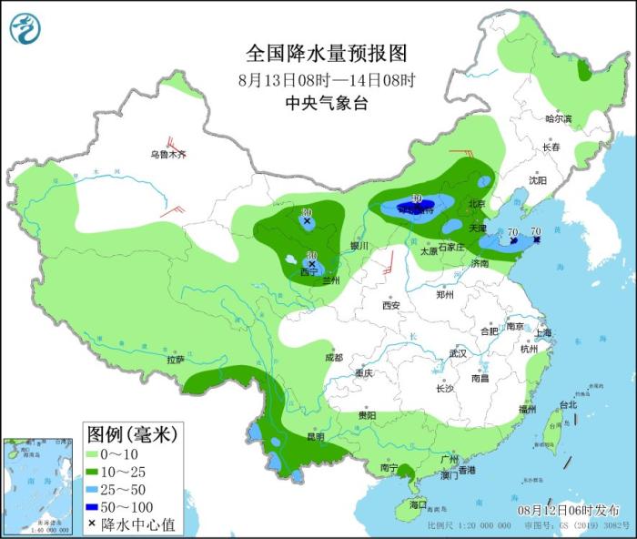 8月13日08時(shí)至14日08時(shí),內(nèi)蒙古中西部、青海東北部、甘肅中部、華北中北部、山東中北部、云南南部等地部分地區(qū)有中到大雨,其中,內(nèi)蒙古中部、山東半島北部等地部分地區(qū)有暴雨(50~90毫米)。內(nèi)蒙古中部、新疆沿天山地區(qū)和南疆盆地等地部分地區(qū)有4~6級風(fēng)。