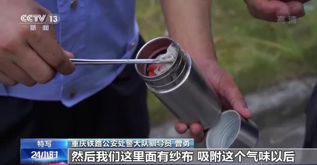 重慶鐵路公安處警犬隊(duì)馴導(dǎo)員 曾勇:這是我們訓(xùn)練用的乳化炸藥,然后我們這里面有紗布,吸附這個(gè)氣味后,就可以放在箱子里面,然后讓搜爆犬來進(jìn)行搜尋。如果它坐下或者臥下示警的話,就表示這個(gè)箱子里有危險(xiǎn)品。