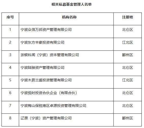 中新網(wǎng)8月17日電 寧波證監(jiān)局16日發(fā)布關(guān)于要求相關(guān)私募基金管理人的有關(guān)負(fù)責(zé)人到寧波證監(jiān)局接受監(jiān)管約談的通知。通知顯示,寧波證監(jiān)局2022年3月30日印發(fā)《關(guān)于開展轄區(qū)私募基金管理人2022年自查工作的通知》(甬證監(jiān)發(fā)〔2022〕12號),并于2022年6月6日發(fā)布《關(guān)于寧波轄區(qū)2022年逾期未完成自查工作的私募機(jī)構(gòu)專項(xiàng)通報(第一批)》,截至2022年8月16日,以下8家機(jī)構(gòu)仍未按要求完成相關(guān)工作。