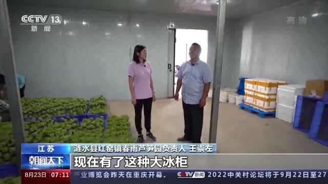 江蘇省漣水縣紅窯鎮(zhèn)春雨蘆筍園負(fù)責(zé)人 王崇左:過去天熱的兩個月我們就不采收,現(xiàn)在有了這種大冰柜,可以大膽采收了。