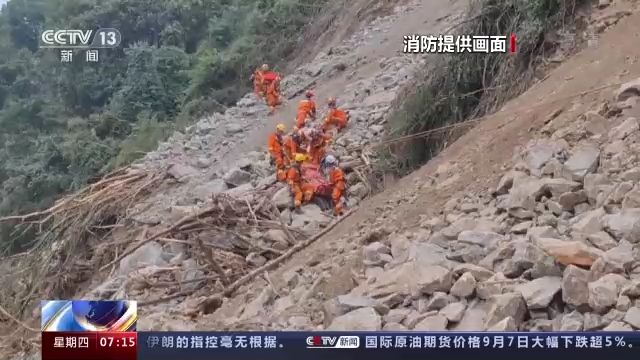 繩橋搭建完成后,消防員徒步跨過阻擋在道路中央的石塊,將小孩和病情危重的老人進行轉移。