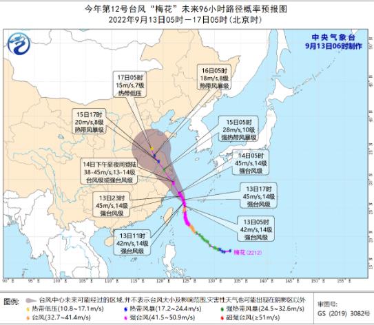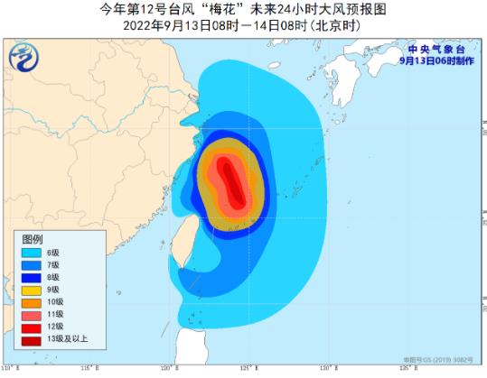 大風預報:9月13日8時至14日8時,巴士海峽、臺灣海峽北部、臺灣以東洋面、黃海西南部海域、東海大部及釣魚島附近海域、長江口區(qū)、杭州灣以及臺灣島北部和東部沿海、浙江沿海、福建北部沿海、上海沿海、江蘇東南部沿海將有6-8級大風,陣風9-11級,其中東海部分海域將有9-11級大風,陣風12-14級,“梅花”中心經(jīng)過的附近海面的風力有12-14級,陣風可達15-16級。
