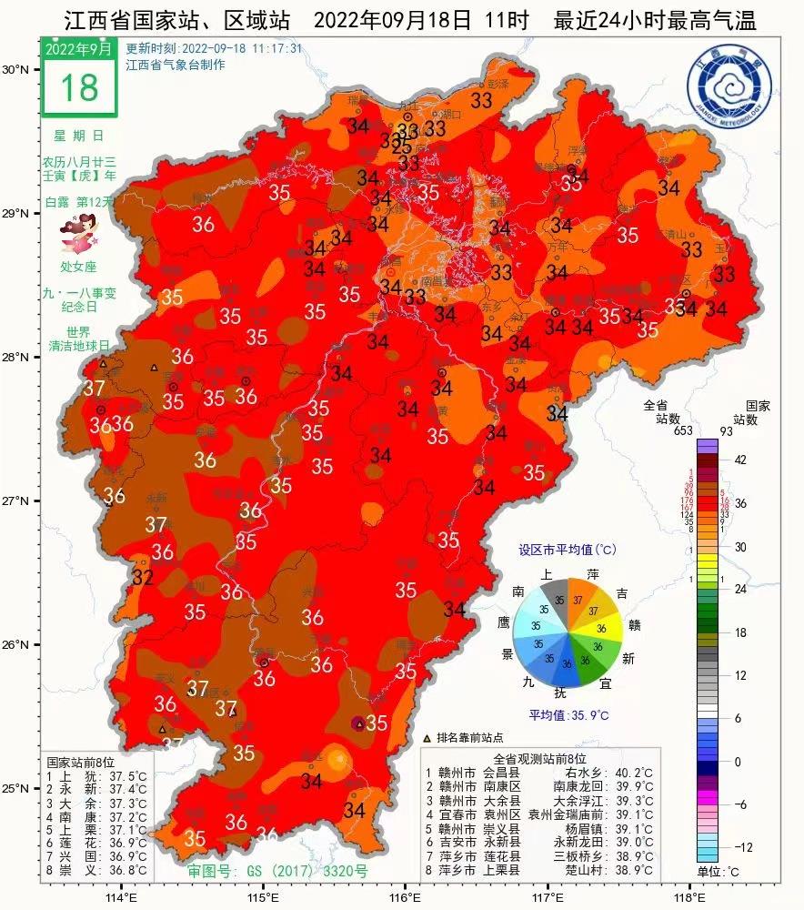記者從江西省氣象臺和省突發(fā)事件預(yù)警信息發(fā)布中心獲悉,9月18日江西省有1159個氣象監(jiān)測站最高氣溫超35℃,90個氣象監(jiān)測站最高氣溫超38℃,覆蓋全省11個地市。