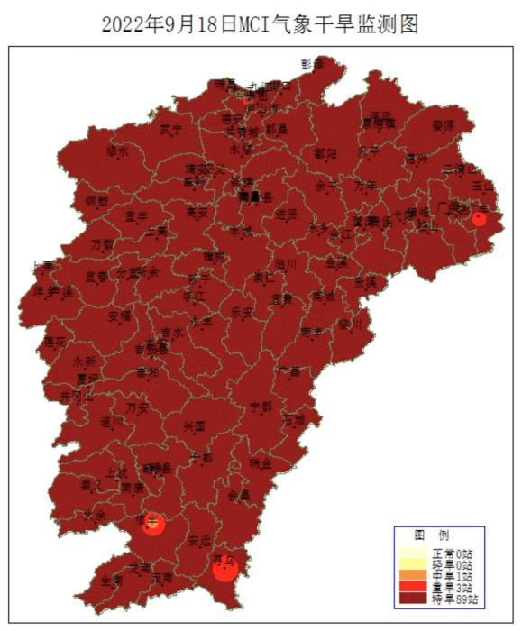 今天(19日),江西高溫持續(xù),由于無有效降雨,全省95.7%的縣(市、區(qū))出現(xiàn)特重氣象干旱。7月12日江西局部開始出現(xiàn)重度氣象干旱以來至今已持續(xù)69天,森林火險氣象等級4(高)至5級(極高)。