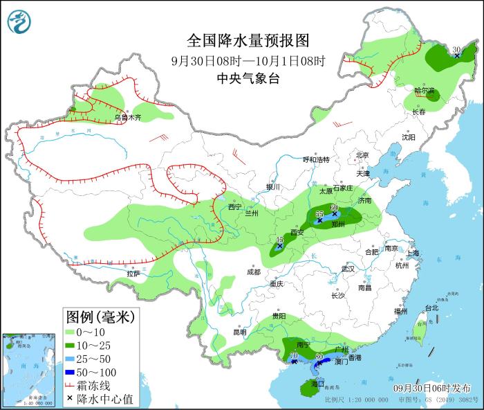 9月30日08時至10月1日08時,廣西南部、廣東西南部、海南島、四川東北部、陜西南部、山西南部、河南北部等地的部分地區(qū)有中到大雨,局地暴雨(50~70毫米);黑龍江、吉林北部、新疆沿天山地區(qū)、青藏高原中東部等地的部分地區(qū)有小到中雨。新疆東部、內(nèi)蒙古中西部、東北地區(qū)東部等地的部分地區(qū)有4~6級風,新疆東部部分地區(qū)有7~8級風。