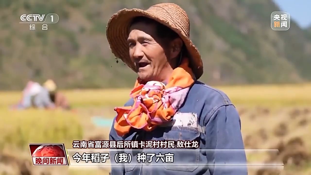 云南省富源縣后所鎮(zhèn)卡泥村村民 敖仕龍:今年稻子種了六畝,一畝收得到二十口袋,這個(gè)稻子比去年飽滿,比去年稱得出來(lái)(重),價(jià)格也比去往年好點(diǎn)。