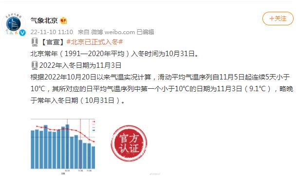 中新網(wǎng)11月10日電 據(jù)北京市氣象局官方微博消息,北京常年(1991—2020年平均)入冬時(shí)間為10月31日,2022年入冬日期為11月3日。