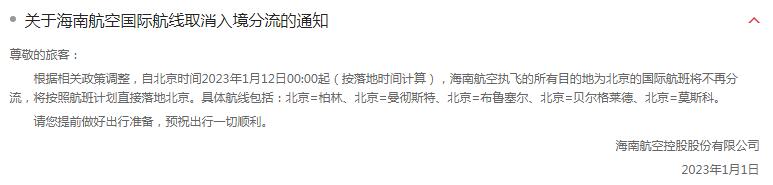 海南航空:1月12日起目的地為北京的國(guó)際航班將不再分流