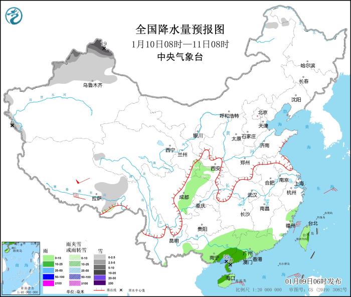 圖1 全國降水量預報圖(1月9日08時-10日08時)