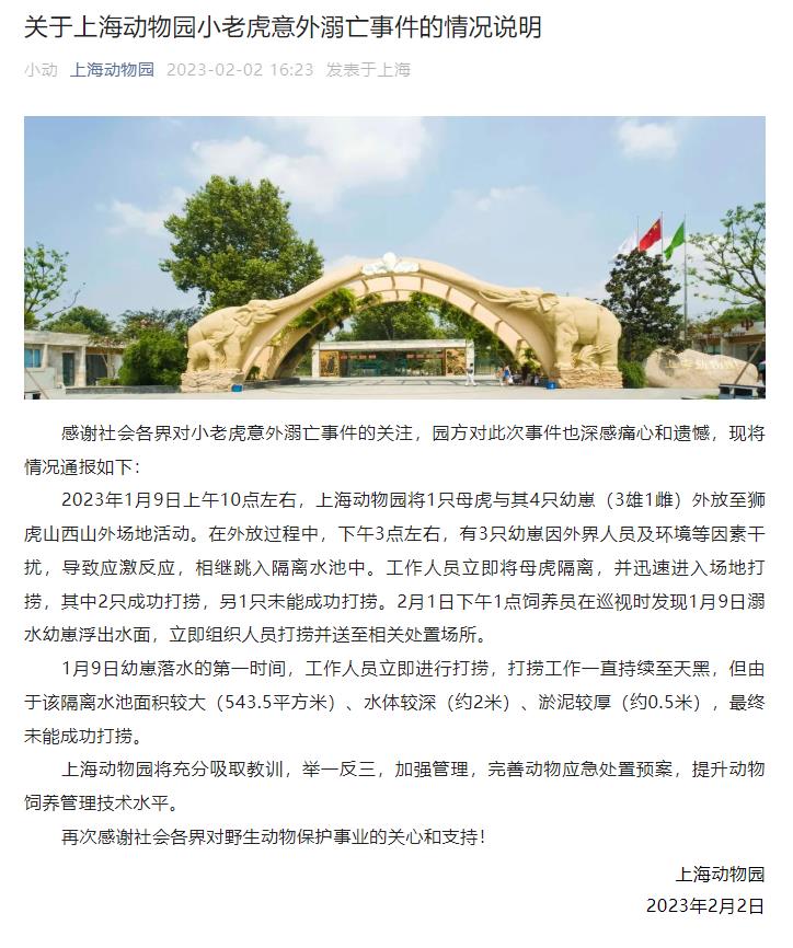 中新網(wǎng)2月2日電 據(jù)“上海動(dòng)物園”微信公眾號(hào)消息,上海動(dòng)物園2日發(fā)布關(guān)于上海動(dòng)物園小老虎意外溺亡事件的情況說明,2023年1月9日上午10點(diǎn)左右,上海動(dòng)物園將1只母虎與其4只幼崽(3雄1雌)外放至獅虎山西山外場(chǎng)地活動(dòng)。在外放過程中,下午3點(diǎn)左右,有3只幼崽因外界人員及環(huán)境等因素干擾,導(dǎo)致應(yīng)激反應(yīng),相繼跳入隔離水池中。工作人員立即將母虎隔離,并迅速進(jìn)入場(chǎng)地打撈,其中2只成功打撈,另1只未能成功打撈。2月1日下午1點(diǎn)飼養(yǎng)員在巡視時(shí)發(fā)現(xiàn)1月9日溺水幼崽浮出水面,立即組織人員打撈并送至相關(guān)處置場(chǎng)所。