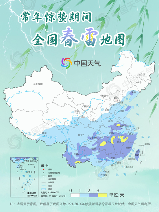 從中國天氣網(wǎng)推出的驚蟄節(jié)氣全國春雷地圖看,“驚蟄始雷”只與我國南方部分地區(qū)的氣候比較吻合。常年驚蟄期間,江南大部、云南大部、貴州南部、重慶中部、華南北部等地雷響頻繁,平均雷暴日數(shù)在2天以上,湖南、江西的部分地區(qū)可超過3天;最符合“驚蟄始雷”的是長江流域,合肥、福州、廣州、南京、杭州、上海等不少地方都在此時(shí)節(jié)迎來初雷。
