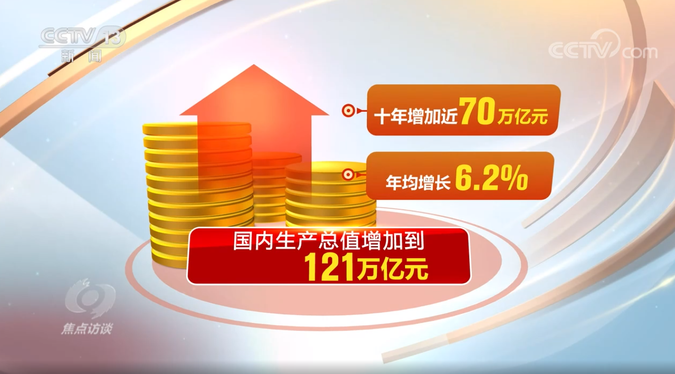 這五年,我國經(jīng)濟(jì)發(fā)展再上新臺(tái)階。國內(nèi)生產(chǎn)總值增加到121萬億元,五年年均增長5.2%,十年增加近70萬億元、年均增長6.2%,在高基數(shù)基礎(chǔ)上實(shí)現(xiàn)了中高速增長、邁向高質(zhì)量發(fā)展。